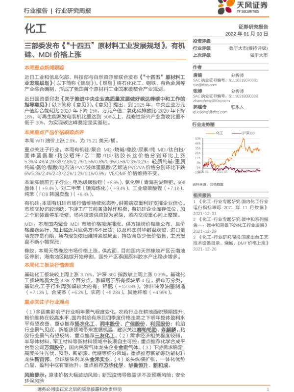 【天风证券】【20220103】20220103-天风证券-化工行业研究周报:三部委发布《“十四五”原材料工业发展规划》,有机硅、MDI价格上涨-20页 行业研究
