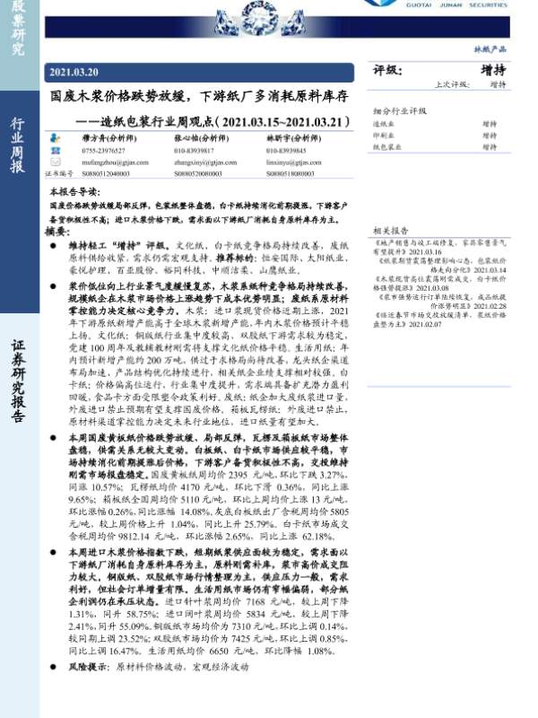 【国泰君安证券】【20210320】20210320-国泰君安-造纸包装行业周观点:国废木浆价格跌势放缓,下游纸厂多消耗原料库存-4页 行业研究