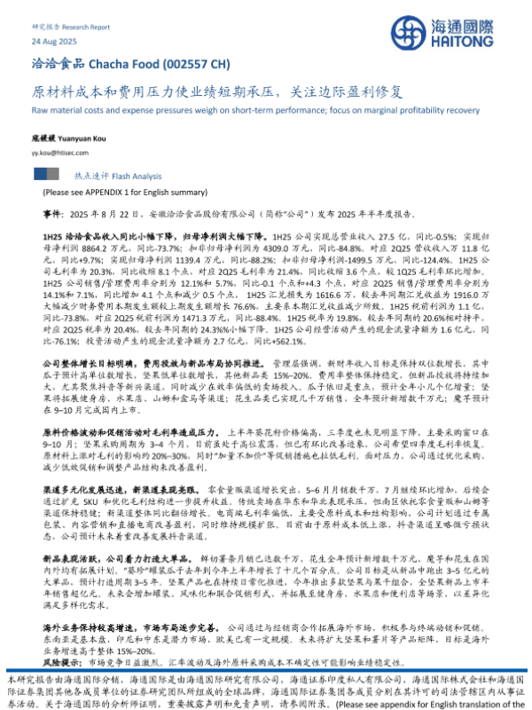 【海通国际】【202508】原材料成本和费用压力使业绩短期承压,关注边际盈利修复-10页 公司研究