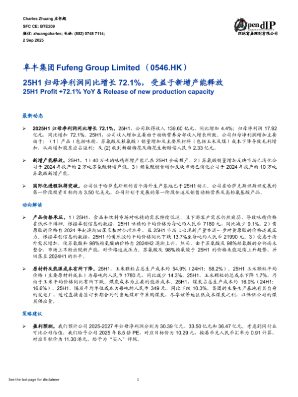 【Charles Zhuang】【202509】阜丰集团-25H1归母净利润同比增长72.1%,受益于新增产能释放-6页 证券期货研究报告