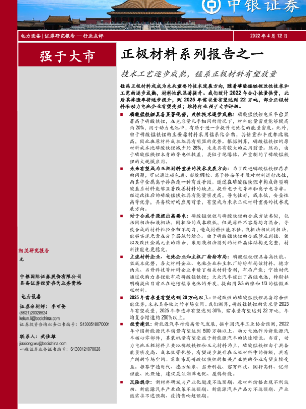 【中银证券】【20220412】正极材料系列报告之一:技术工艺逐步成熟,锰系正极材料有望放量-9页 行业研究