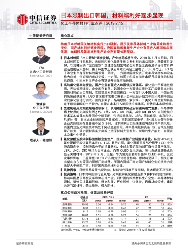 【中信证券】【20190715】化工半导体材料行业点评:日本限制出口韩国,材料端利好逐步显现-3页 行业研究