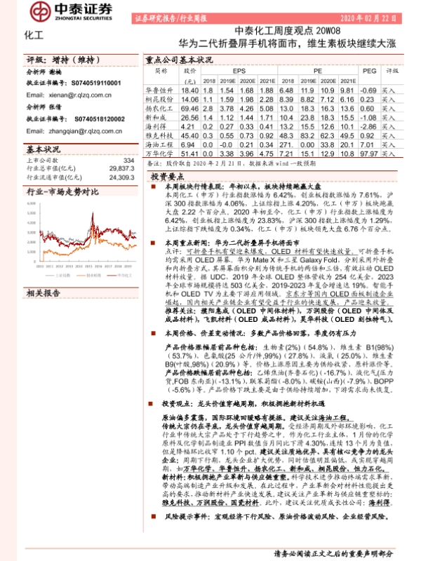 【中泰证券】【20200222】中泰化工周度观点20W08:华为二代折叠屏手机将面市,维生素板块继续大涨-21页 行业研究