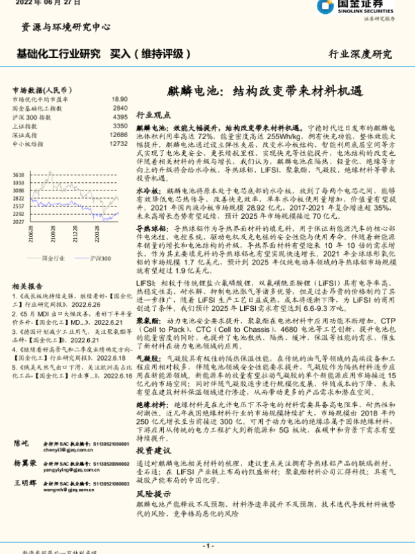 【国金证券】【20220627】基础化工行业深度研究:麒麟电池,结构改变带来材料机遇-27页 行业研究