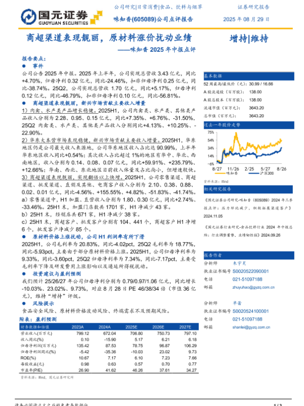 【国元证券】【20250829】味知香-商超渠道表现靓丽,原材料涨价扰动业绩-3页 证券期货研究报告