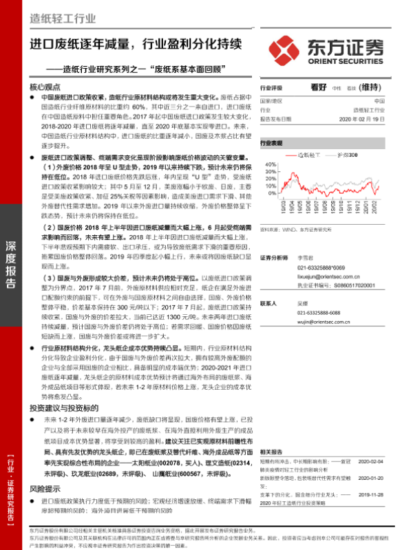 【东方证券】【20200219】造纸行业研究系列之一“废纸系基本面回顾”:进口废纸逐年减量,行业盈利分化持续-20页 行业研究