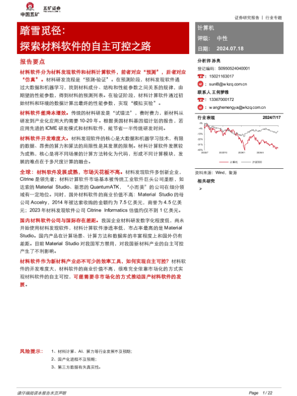 【五矿证券】【20240718】计算机行业-踏雪觅径:探索材料软件的自主可控之路-22页 行业研究