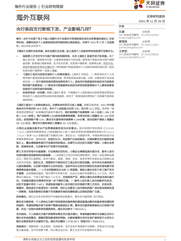 【天风证券】【20211129】央行条码支付新规下发,产业影响几何?-4页 行业研究