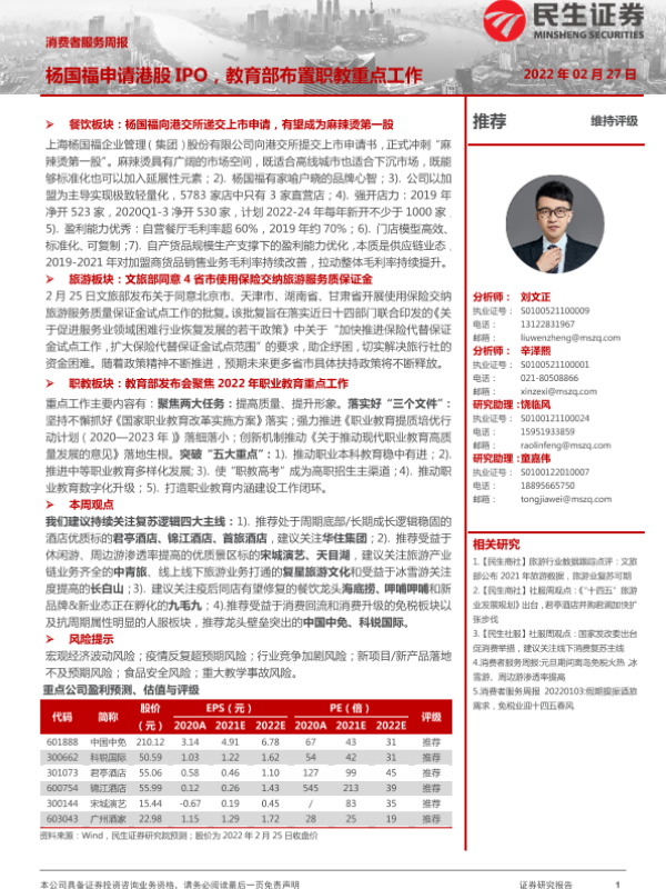 【民生证券】【20220227】消费者服务周报:杨国福申请港股IPO,教育部布置职教重点工作-29页 行业研究