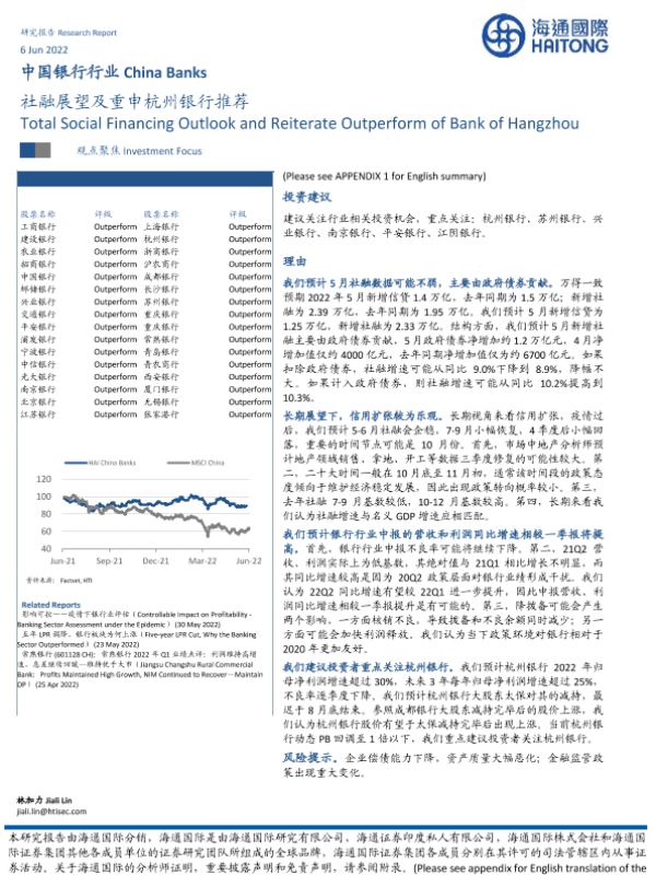 【海通国际】【20220606】中国银行行业:社融展望及重申杭州银行推荐-10页 行业研究