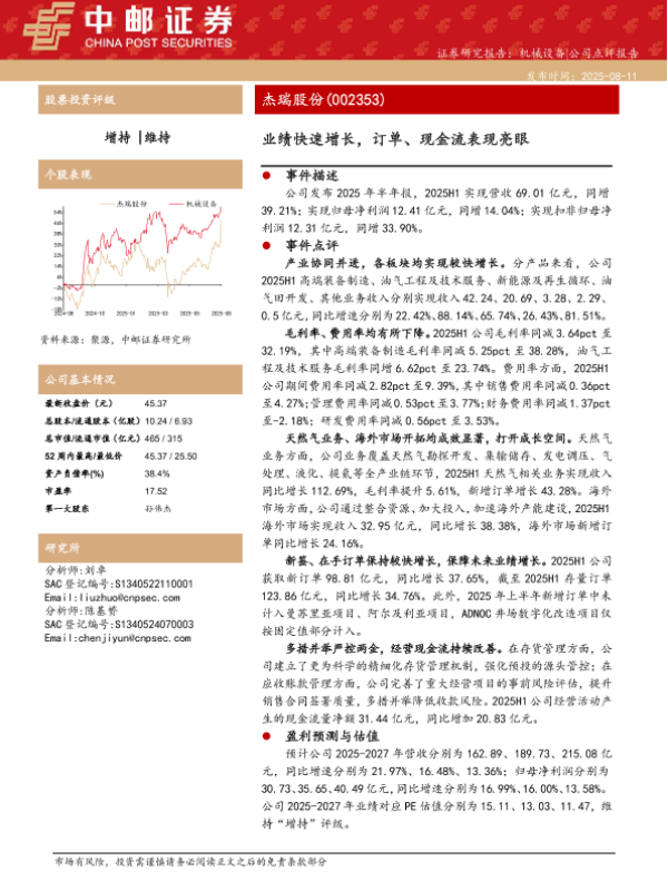 【华龙证券】【20250808】订单集中落地带动业绩增长,海外及天然气业务增长亮眼-4页 证券期货研究报告