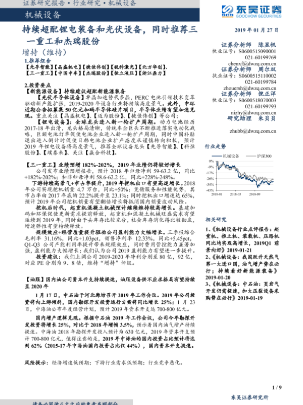 【东吴证券】【20190127】机械设备:持续超配锂电装备和光伏设备,同时推荐三一重工和杰瑞股份-9页 行业研究