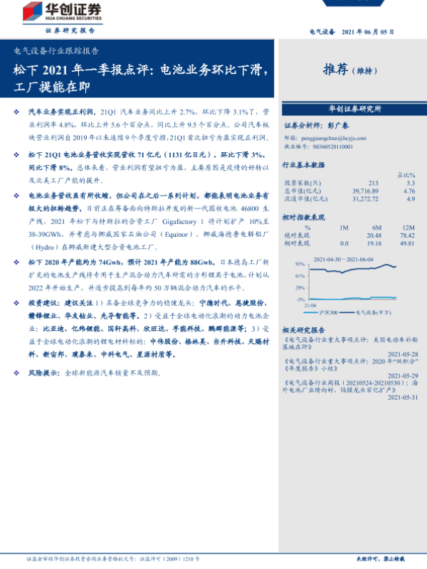 【华创证券】【20210605】20210605-华创证券-电气设备行业跟踪报告:松下2021年一季报点评:电池业务环比下滑,推荐(维持)工厂提能在即-5页 行业研究