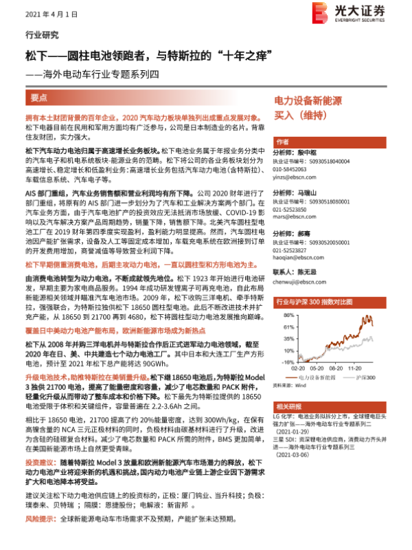 【光大证券】【20210401】海外电动车行业专题系列四:松下,圆柱电池领跑者,与特斯拉的“十年之痒”-33页 行业研究