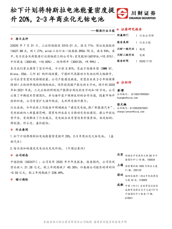 【川财证券】【20200731】制造行业日报:松下计划将特斯拉电池能量密度提升20%,2-3年商业化无钴电池-4页 证券期货研究报告