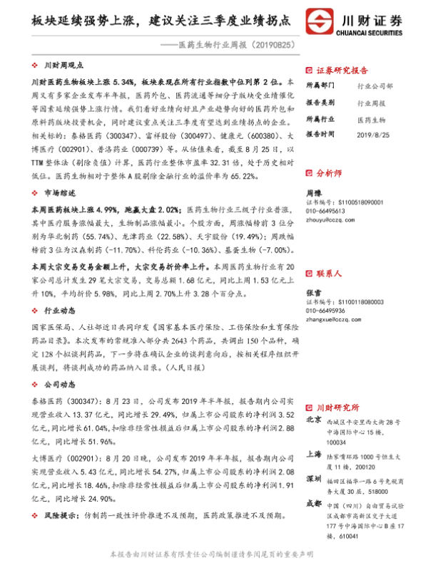【川财证券】【20190825】医药生物行业周报:板块延续强势上涨,建议关注三季度业绩拐点-14页 行业研究