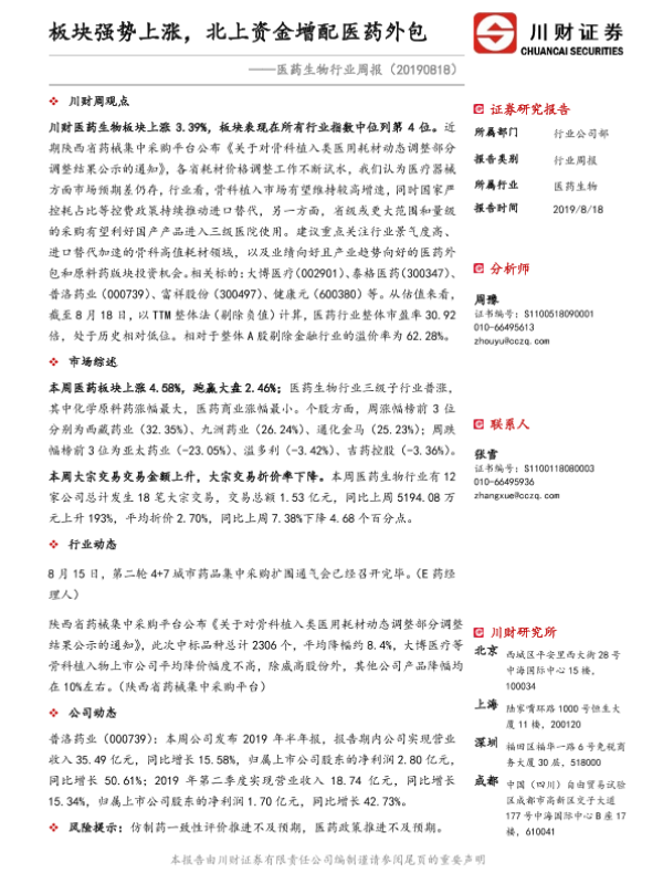 【川财证券】【20190818】医药生物行业周报:板块强势上涨,北上资金增配医药外包-12页 行业研究