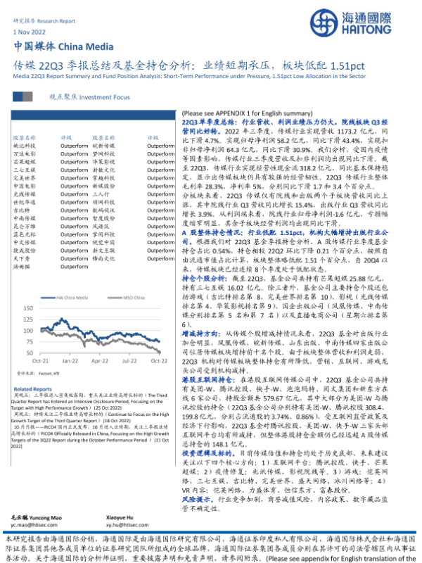【海通国际】【20221101】传媒22Q3季报总结及基金持仓分析:业绩短期承压,板块低配1.51pct-17页 行业研究