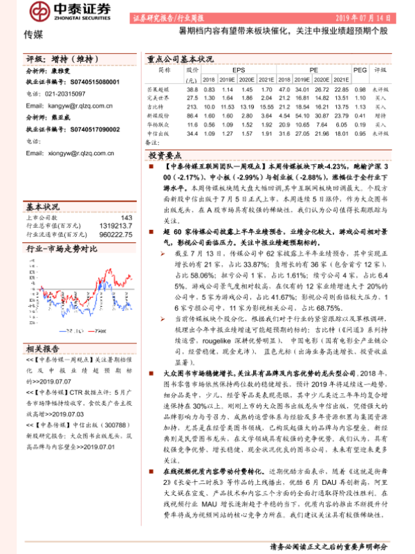 【中泰证券】【20190714】20190714-中泰证券-传媒行业周报:暑期档内容有望带来板块催化,关注中报业绩超预期个股-15页 行业研究