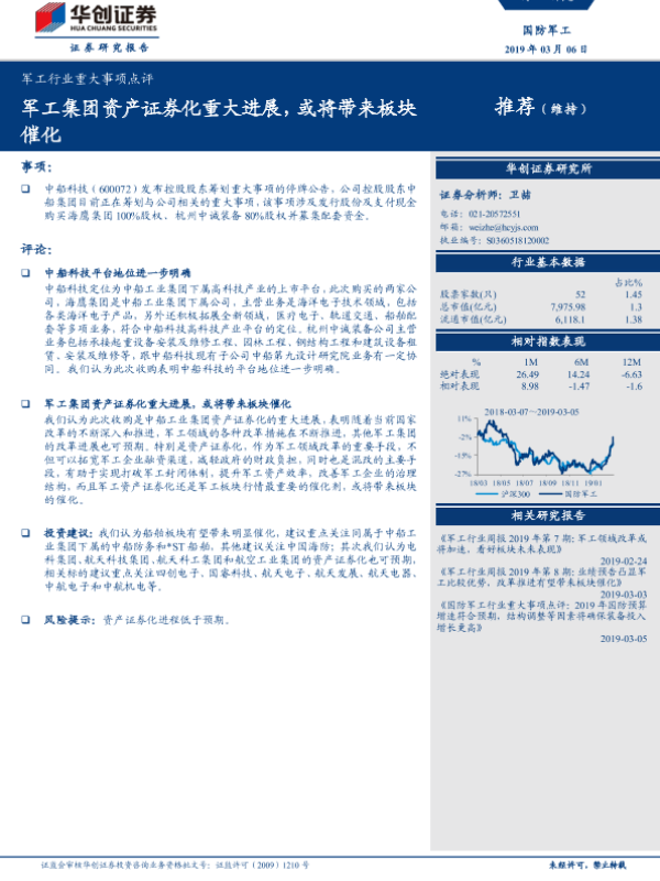 【华创证券】【20190306】军工行业重大事项点评:军工集团资产证券化重大进展,或将带来板块催化-3页 行业研究