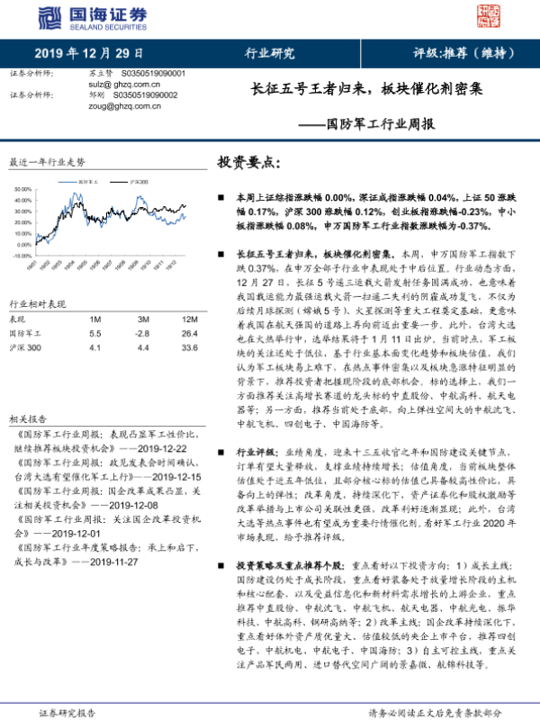 【国海证券】【20191229】国防军工行业周报:长征五号王者归来,板块催化剂密集-13页 行业研究