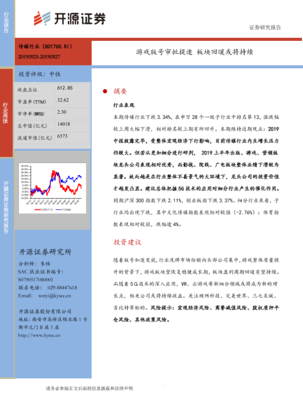 【开源证券】【20190930】传媒行业:游戏版号审批提速 板块回暖或将持续-11页 行业研究