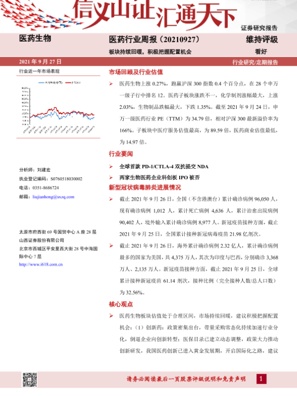 【山西证券】【20210927】医药行业周报:板块持续回暖,积极把握配置机会-9页 行业研究