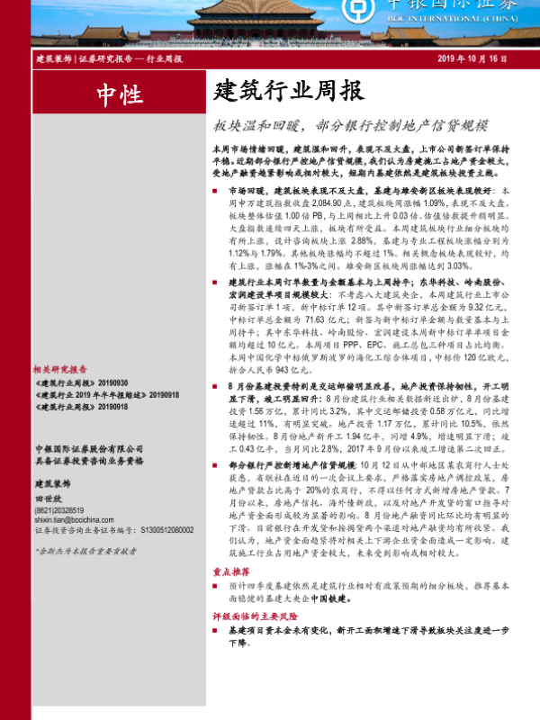 【中银证券】【20191016】建筑行业周报:板块温和回暖,部分银行控制地产信贷规模-13页 行业研究
