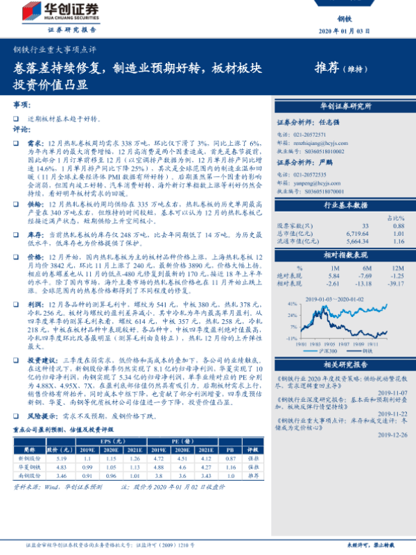 【华创证券】【20200103】钢铁行业重大事项点评:卷落差持续修复,制造业预期好转,板材板块投资价值凸显-4页 行业研究
