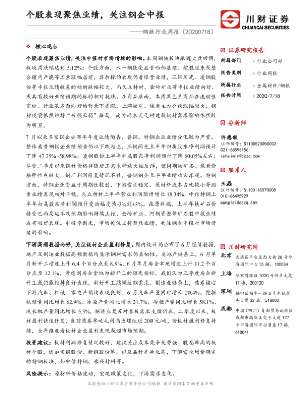 【川财证券】【20200718】20200718-川财证券-钢铁行业周报:个股表现聚焦业绩,关注钢企中报-17页 行业研究