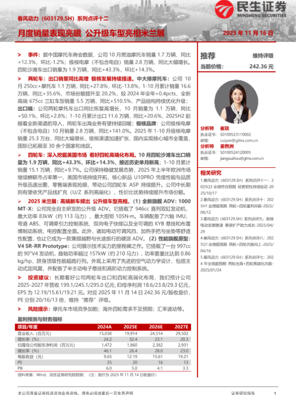 【民生证券】【202511】系列点评十二:月度销量表现亮眼 公升级车型亮相米兰展-4页 证券期货研究报告