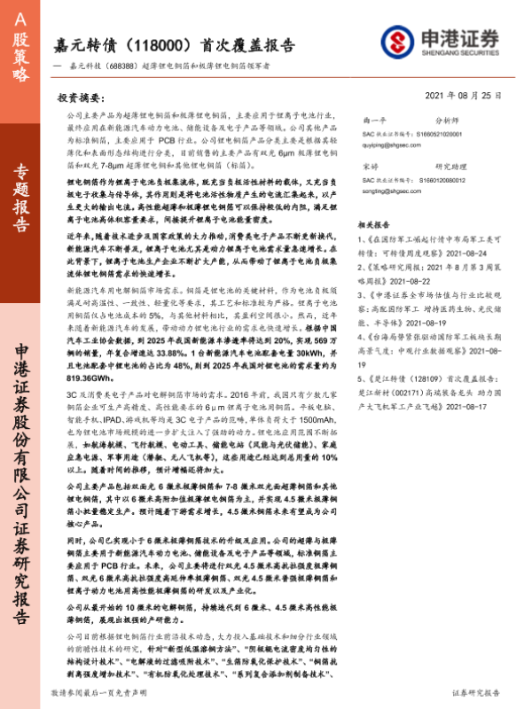 【申港证券】【20210825】嘉元转债(118000)首次覆盖报告:嘉元科技(688388),超薄锂电铜箔和极薄锂电铜箔领军者-28页 行业研究