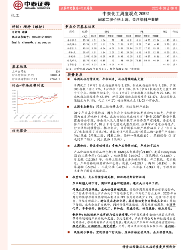 【中泰证券】【20200808】中泰化工周度观点20W31:间苯二胺价格上调,关注染料产业链-26页 行业研究