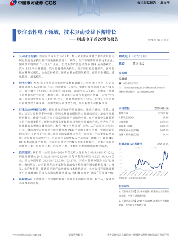 【银河证券】【20240816】则成电子(837821)首次覆盖报告:专注柔性电子领域,技术驱动受益下游增长-14页 行业研究