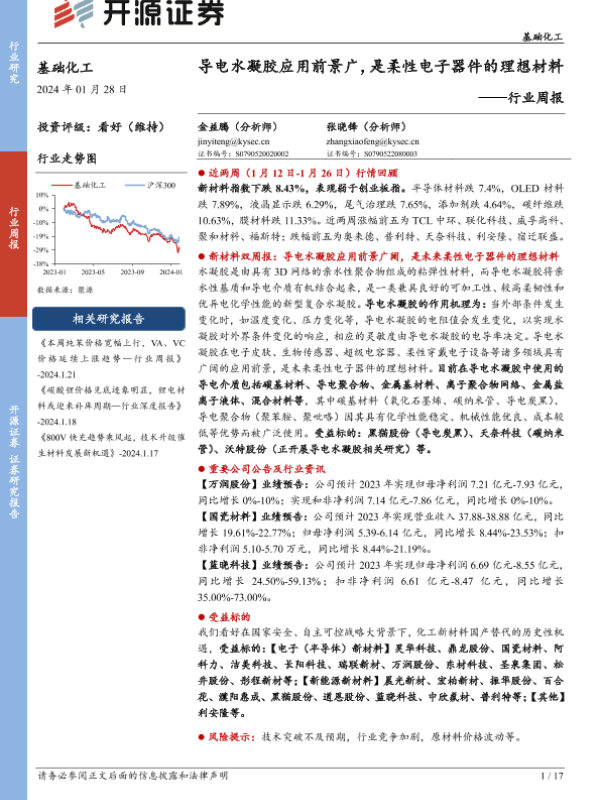 【开源证券】【20240128】20240128-开源证券-基础化工行业周报:导电水凝胶应用前景广,是柔性电子器件的理想材料-17页 行业研究