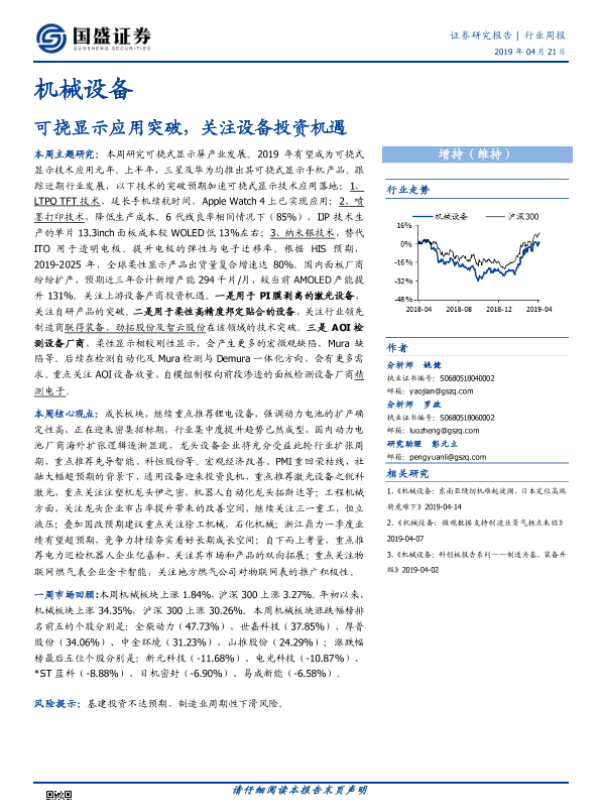 【国盛证券】【20190421】20190421-国盛证券-机械设备行业周报:可挠显示应用突破,关注设备投资机遇-18页 行业研究
