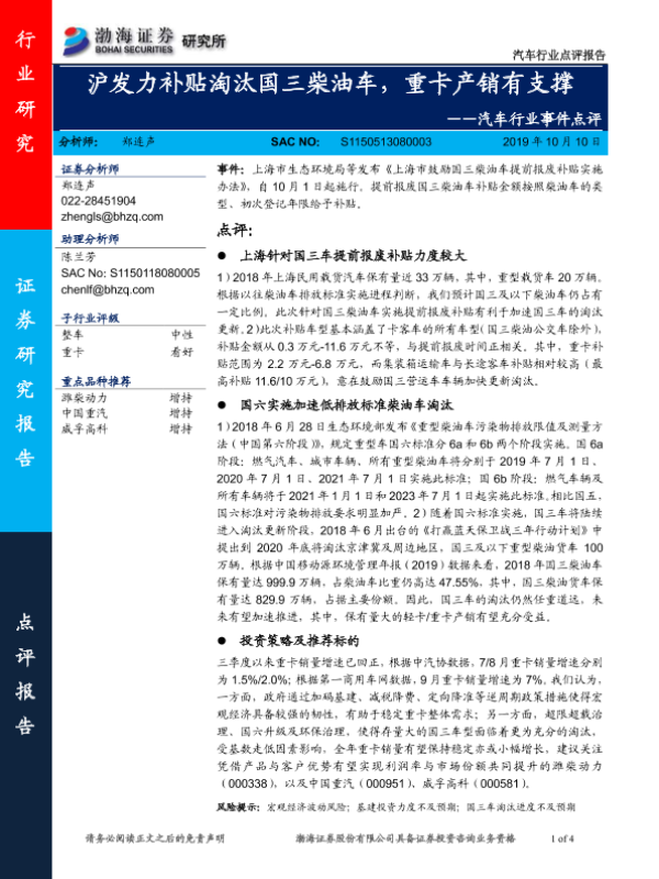 【渤海证券】【20191010】汽车行业事件点评:沪发力补贴淘汰国三柴油车,重卡产销有支撑-4页 行业研究