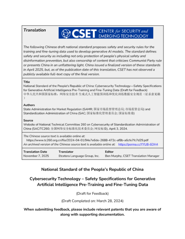 【国家市场监督管理总局&国家标准委】【202404】中华人民共和国国家标准:网络安全技术生成式人工智能预训练和优化训练数据安全规范(征求意见稿)-21页 政策文件