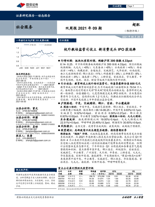 【国信证券】【20210628】社会服务双周报2021年09期:校外教培监管司设立 新消费龙头IPO获追捧-7页 行业研究