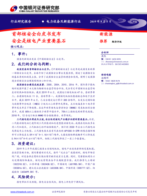 【银河证券】【20190905】首部核安全白皮书发布 安全是核电产业重要基石-3页 行业研究