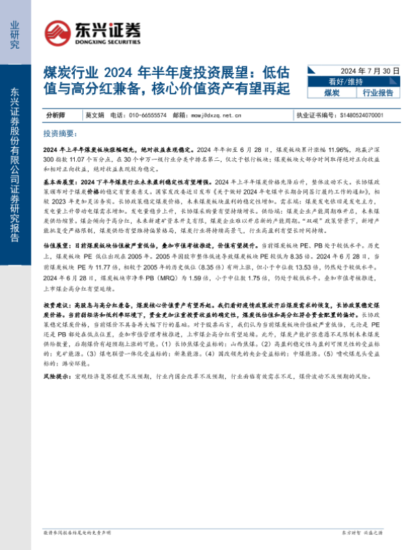 【东兴证券】【20240730】煤炭行业2024年半年度投资展望:低估值与高分红兼备,核心价值资产有望再起-13页 行业研究