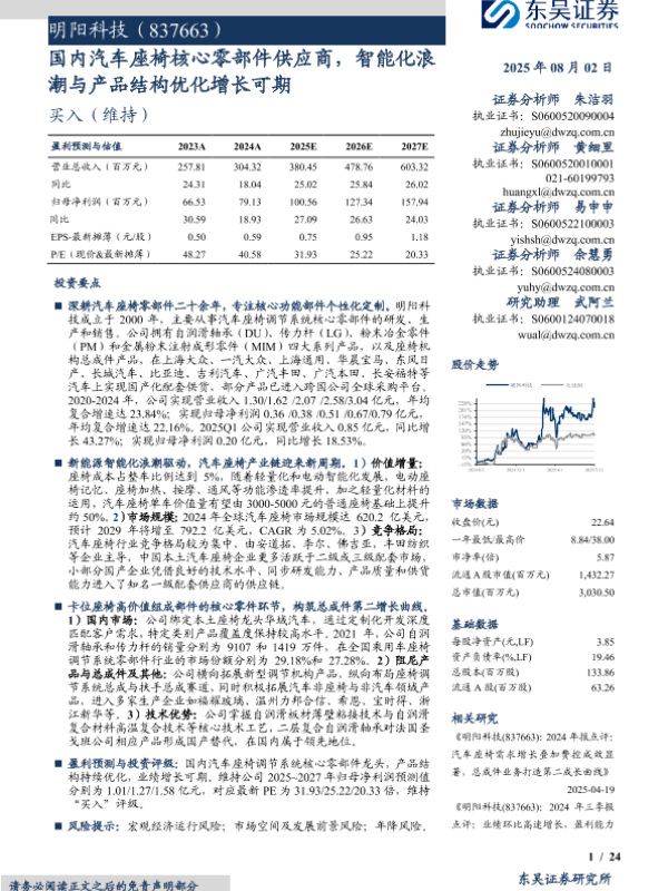 【东吴证券】【202508】明阳科技(837663):国内汽车座椅核心零部件供应商,智能化浪潮与产品结构优化增长可期-24页 证券期货研究报告
