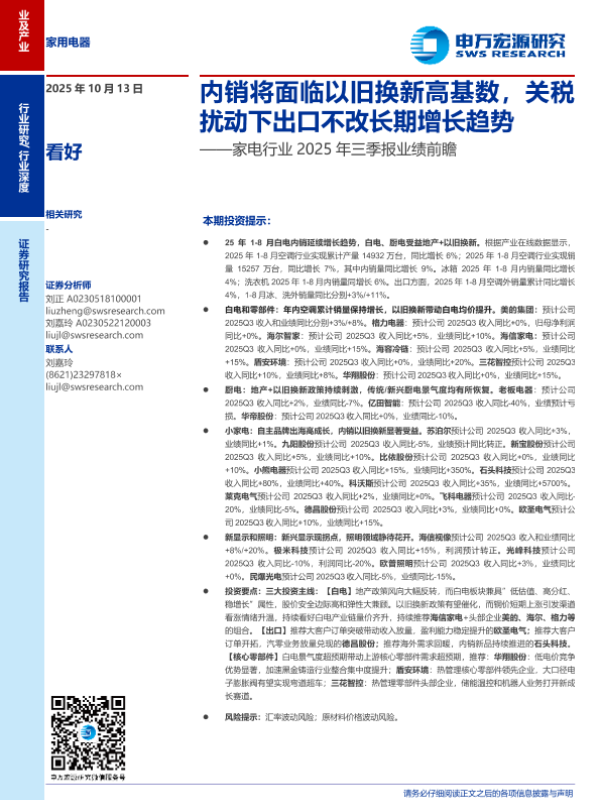 【申万宏源】【202510】家电行业2025年三季报业绩前瞻:内销将面临以旧换新高基数,关税扰动下出口不改长期增长趋势-28页 证券期货研究报告