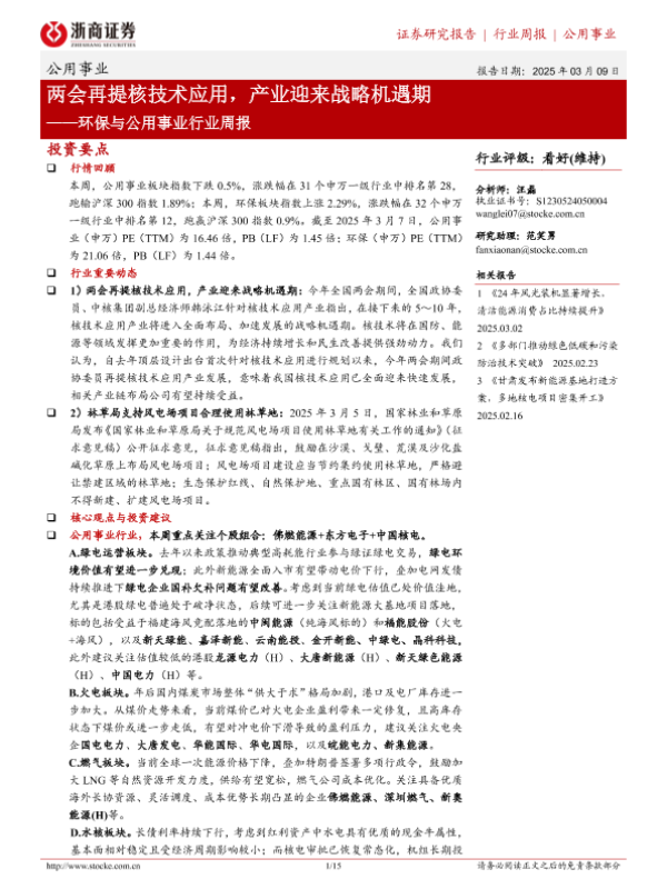 【浙商证券】【20250309】环保与公用事业行业周报:两会再提核技术应用,产业迎来战略机遇期-15页 行业研究