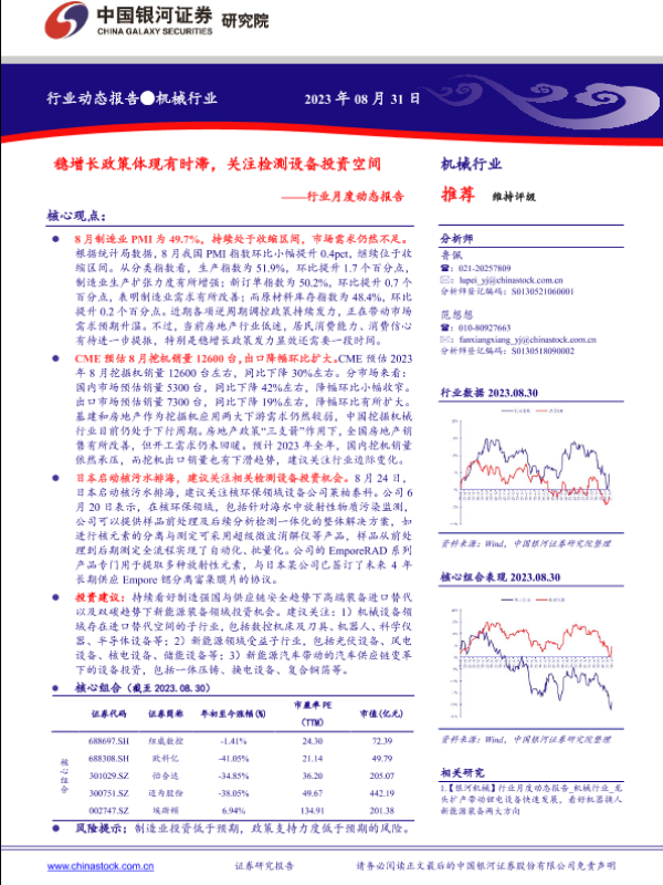 【银河证券】【20230831】机械行业月度动态报告:稳增长政策体现有时滞,关注检测设备投资空间-30页 行业研究