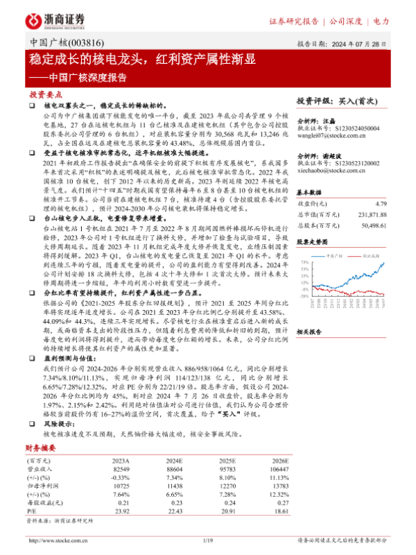 【浙商证券】【20240728】中国广核深度报告:稳定成长的核电龙头,红利资产属性渐显-19页 行业研究