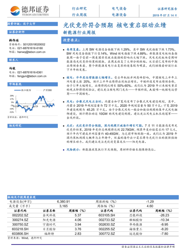 【德邦证券】【20190714】20190714-德邦证券-新能源行业周报:光伏竞价符合预期 核电重启驱动业绩-10页 行业研究