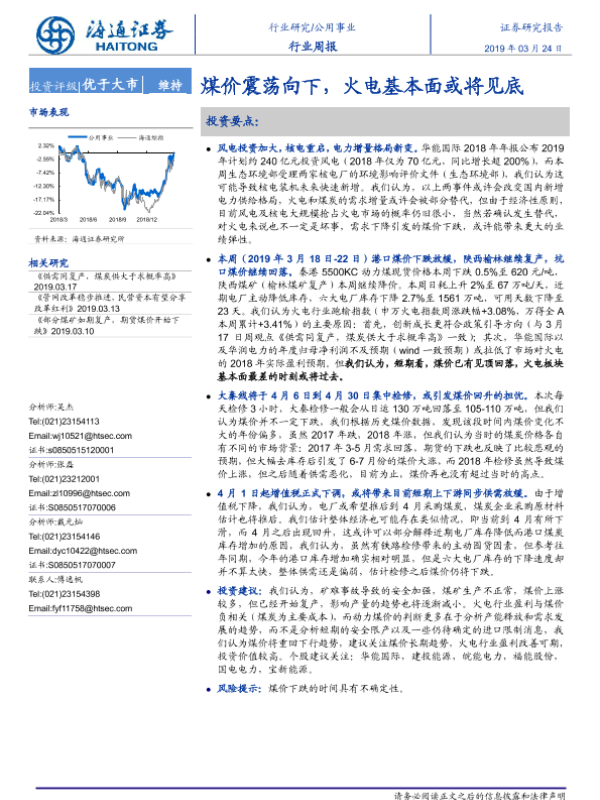 【海通证券】【20190324】公用事业行业周报:煤价震荡向下,火电基本面或将见底-2页 行业研究