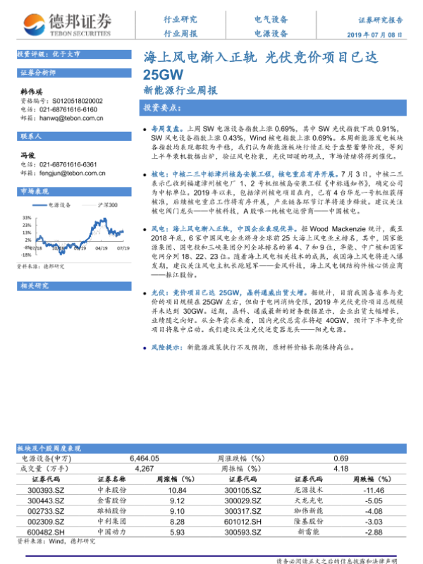 【德邦证券】【20190708】20190708-德邦证券-新能源行业周报:海上风电渐入正轨 光伏竞价项目已达25GW-11页 行业研究