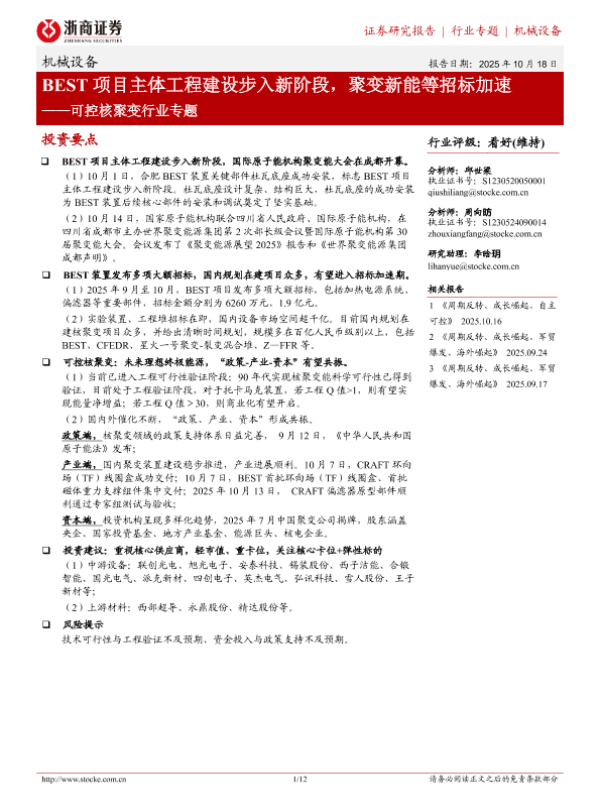 【浙商证券】【202510】可控核聚变行业专题:BEST项目主体工程建设步入新阶段,聚变新能等招标加速-12页 证券期货研究报告